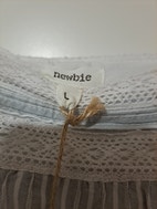 Käyttämätön Newbie kesämekko säädettävillä olkaimilla. Materiaalina luomupuuvilla. Helmassa ja rinnuksessa kauniit yksityiskohdat. Mekon vyö on irrotettava ja helma ulottuu säären puoliväliin.