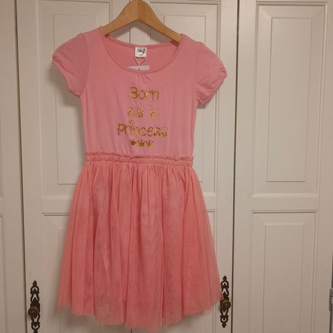 Nafti koko, ottaisin käyttöön aiemmin, siinä 122 - 128cm, mutta toki makuasioita ja riippuen lapsen mittasuhteista. Glitteriä painatuksessa, tyllissä pieniä timatteja.