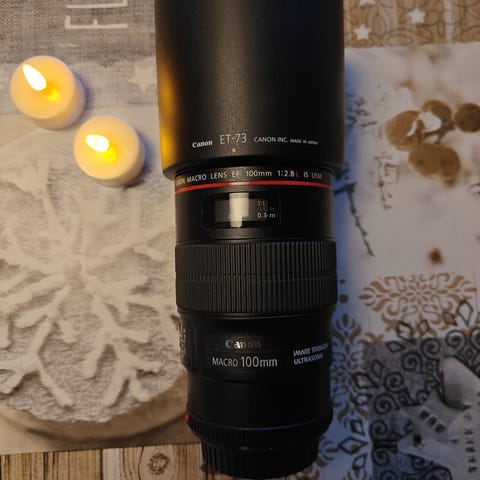 Canonin makrolinssi 100mm, aukko 2.8 L sarjalainen kuvanvakaimella ja 3 etäisyyden säätöä käy suoraan EF sarjalaisen runoihin esim 5d mk I II III ja IV, EOS R sarjan kamerat vaativat EF-EOS R mount adapterin. Linssissä ei naarmuja eikä myöskään bajonetin puolella. Mukana vastavalosuoja.