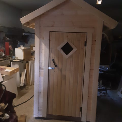 Kuvan mukainen,tasalattiainen huussi.Sisämitoiltaan syv.130-lev.105-kork.keskeltä n.190.yht.nollaviisnolla3287866. lappukatto asennettu, lisävarusteena saatavana koroke-askelma huussin alle jolloin voi asentaa korkean läpi lattian menevän kompostoivan käymälän.Kuljetuskin sopimuksen mukaan.Kysy lisää.Myös isompi malli kooltaan syv.150-lev 117-kork.keskeltä 200cm.Nyt rospuuttokelin hinta.Koroke ja huussi nyt yhteishintaan 500€ Helmikuun loppuun saakka.