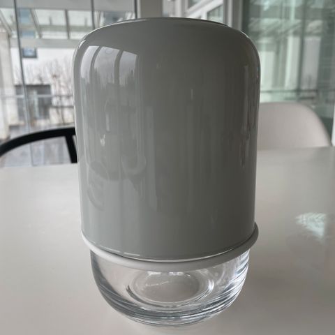 Keltainen/kirkas lasinen Muurlan kapselimaljakko. Ollut oikeastaan vain koristeena, joten hyvässä kunnossa. Saa säädettyä moneen eri kokoon.