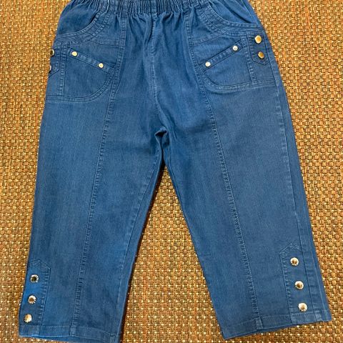 Farkkutyyliset, kuminauhavyötärö, kerran käytetyt. Kuvassa ryppyiset, säilytyksestä.