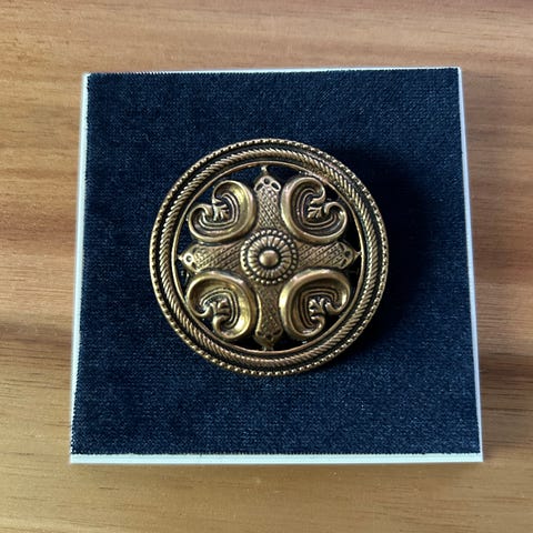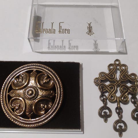 Kalevalakoru Räisälän solki-rintaneula alkuperäisessä pakkauksessaan. Uudenveroinen, kirkas pronssi, ei tummentumia.