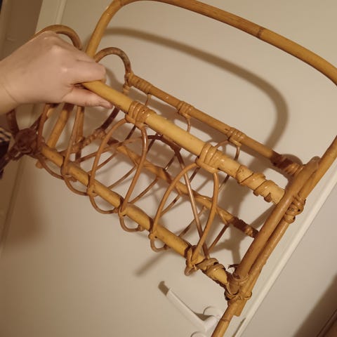 Päällinen korkkia, sisällä ja pohjassa kangas. Kork. kahva mukaan lukien n. 40cm, pituus pohjasta mitattuna 35cm, leveus n. 15cm. Ostettu vuosia sitten, kunto hyvä.