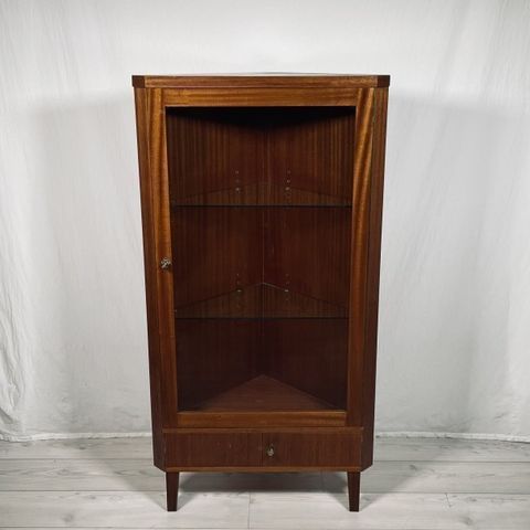 Tuotetiedot: Todella hyvässä kunnossa oleva vanha ja elegantti vitriini, jossa on neljä vetolaatikkoa ja kaksi lasihyllyä, joiden paikat ovat vaihdettavissa. Vitriinin ovi ja sivut ovat osittain lasia.
