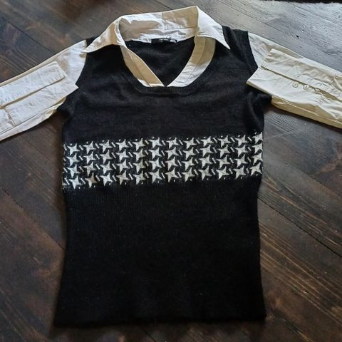 44 koon neulepaita, takana vetoketju. Kivaa paksumpaa neulosta joka ei näy läpi. Kainalo-kainalomitta 55 cm ja venyy. Olka-helmamitta 61 cm