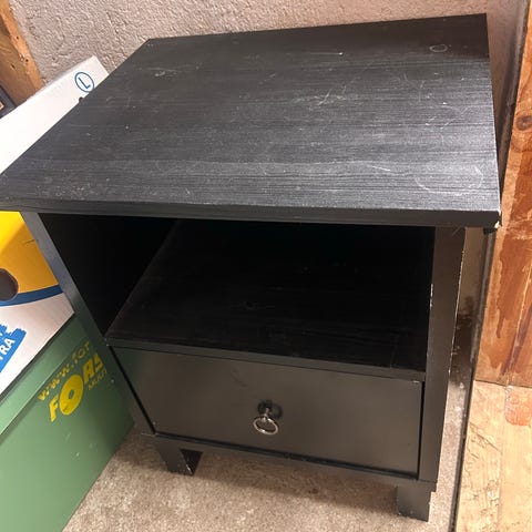 Musta metallinen yöpöytä tai matala sivupöytä. Pöytätaso 47cm korkeudella, kulmatapit 53cm korkeudella.