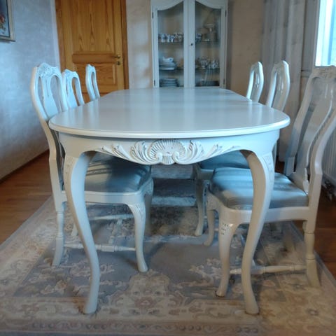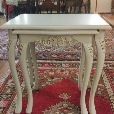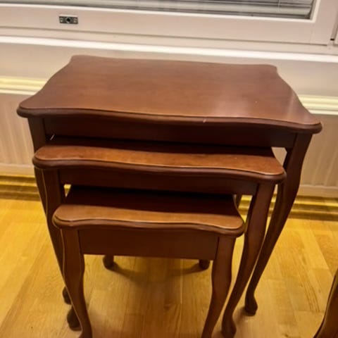 Tuotetiedot: Kotimainen Laitala talonpoikaisrokokoo sarjapöytä. Settiin kuuluu kolme pöytää. Vastaava uutena maksaa 1.475.00 euroa.
