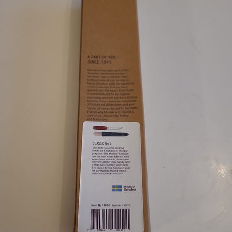 Käyttämätön uutta vastaava Mora puukko nahkaisella tupella. Terän selkäpuoli kalan suomustukseen oiva apuväline. Tupessa näppäri lukitus takaa erämiehen oivan apuvälineen pysymisen vauhdissa mukana.