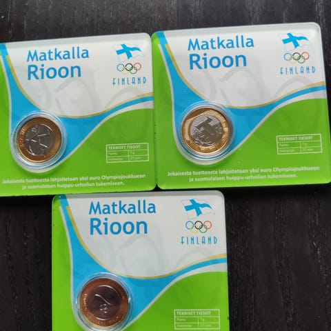 Matkalla Rioon rahojen aiheena on Uinti tai Nyrkkeily. Rahat ovat läpinäkyvissä muovikuorissa. Kolmannessa rahassa, joka on pahvisessa kuoressa, on kuvattu olympialippu ja se on handover kolikko. Siinä on tekstinä Lontoo 2012 - Rio 2016.