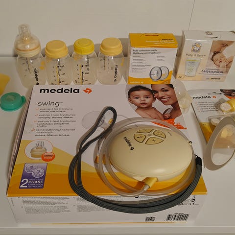 Alipainepumppu, medela maidonkerääjät, mam imetyskumit koko S ja M (2-2 kpl+ kotelot), medela koko 1 (1 kpl). Muutama kkt käytetyt mut aina asianmukaisesti pestyt ja keitetyt. Nuk tuttipullo.