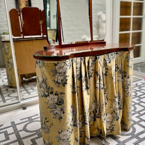 Vintage peilipöytä kukkakuvioisilla verholla, kaunis ja ehjä, ja hatturasiat