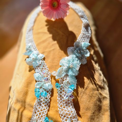 Käsintehty lasihelmistä ja aidosta akaattikivistä lumoava kaulakoru. Itselläni on liian paljon koruja, en vain ehdi käyttää kaikkia.