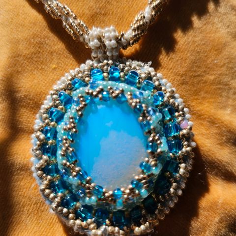Erittain kaunis, käsintehty lasihelmistä ja aidosta kivistä (muistaakseni onyx)kaulakoru. Oma design.