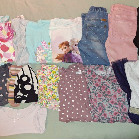 Tyttöjen vaatepaketti kokoa 104cm. Yhteensä 12 vaatetta. Yhdet colleget puuttuu kuvasasta. Mm. Lego& pony pitkähihaiset, collegehousut, neule, t paita, 2xcaprit, Belle college( tässä hihassa pari pinkkiä tahraa, näkyy kyvassa), fleece ja Ralph Lauren kesämekko.