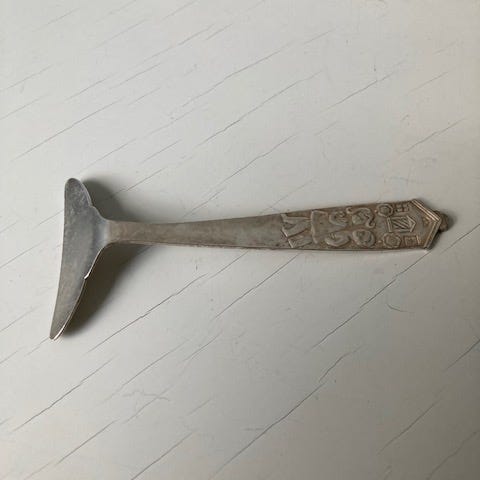 Ruotsalainen lasten aterim, pusher. Design C.G. Hallberg. New Silver, alpakka. Nouto / lähetys ostajan lukuun.