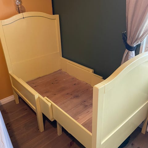 Hieno, siro, päästävedettävä puusänky. Kauniit kohokuviot molemmissa päädyissä.
