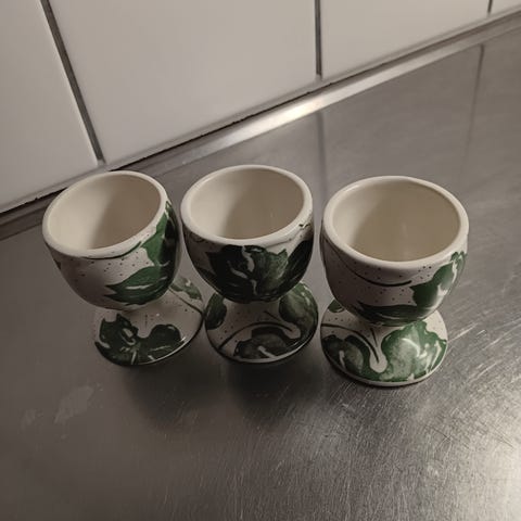 Setti muovisia munakuppeja. Jalkaosa saa ruuvattua tarvittaessa irti. Muutamassa kupissa pienen pieni riksu reunassa. Muuten ehjät ja siistikuntoiset.