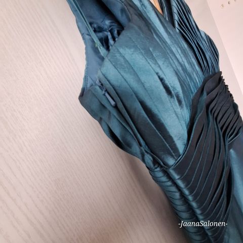 Iltapuku outletista ostettu ja yhdet tanssit tanssittu kaunis kuvanmukainen mekko vetoketjulla, koko xs. Tanssija n. 155cm pitkä ja kengissä korkoa n. 4 cm, joten mekkoa lyhennetty. Olkaimia myös lyhennetty, mutta ompeleet helppo purkaa tai saumasta hieman avaamalla saa vielä lisää pituutta.
