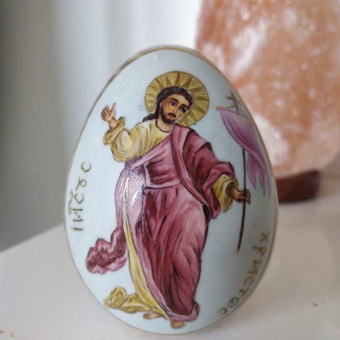 Kuvan mukainen posliini pääsiäismuna. Mitat noin 18x13x8cm. Nouto tai postitus.