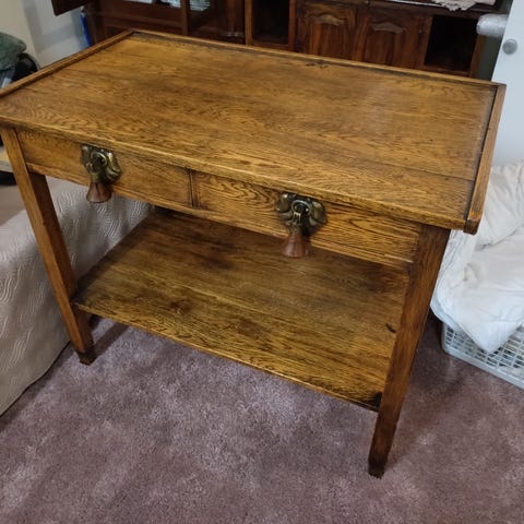 Vanha puhujalipasto, jossa keskiosa on vinossa. Leveys 140 cm, syvyys 61 cm (reunassa) ja korkeus 81 cm (reunassa). Pöytä on puhdistusta vailla.