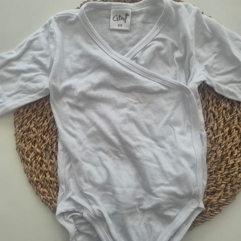 Kaksi vauvan vähän käytettyä bodya (Ciraf). Vaaleankeltaisia, joista toisessa pupukuviointi.