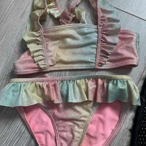 H&M tummansiniset bikinit, joissa kultaisia pilkkuja. Koko 122/128. Yläosassa etupuolella rimpsuhelma, alaosassa molemmilla puolilla. Pieni kultainen koriste olkaimessa. Pientä nyppyä pepussa, muuten oikein siistit, yläosasta leikattu koko/pesulappu pois. Savuton ja karvaton koti.