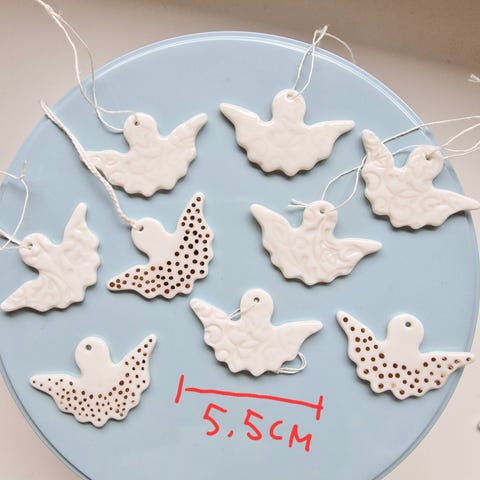 Vatsallaan makaavat posliiniset vauvakoristeet esim. kakun päälle.