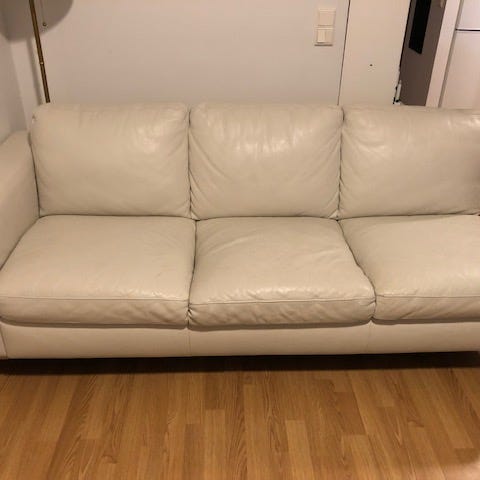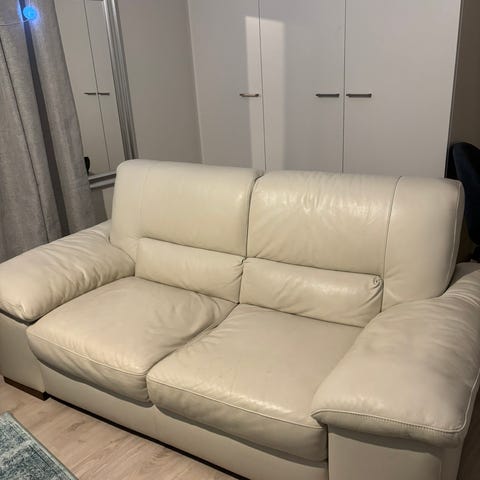 Myydään Italsofa, valkoista nahkaa, 3-istuttava sohva. pinnassa pieniä käytön jälkiä. Sohvassa on tummanruskeat matalat jalat.