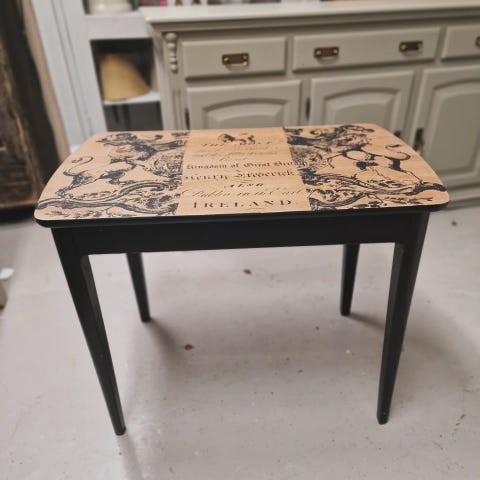 Perinnöksi saatu (alkuperä ei tiedossa) pieni 50-luvun pöytä. Korkeus n 65cm, pöytälevy noin 79cmx54cm. Jalka puuta, pöytälevyn materiaalia en tiedä. Pöytälevy siisti, mutta käytön jälkiä näkyvissä. Vain nouto.