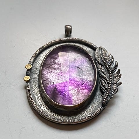 Kaunis hopeariipus, halkaisija 40 mm, kivenä tumma ametisti, 925-leima. Näyttää Kalevalan Mielikiltä, mutta ei ole (lienee jokin mukaelma).