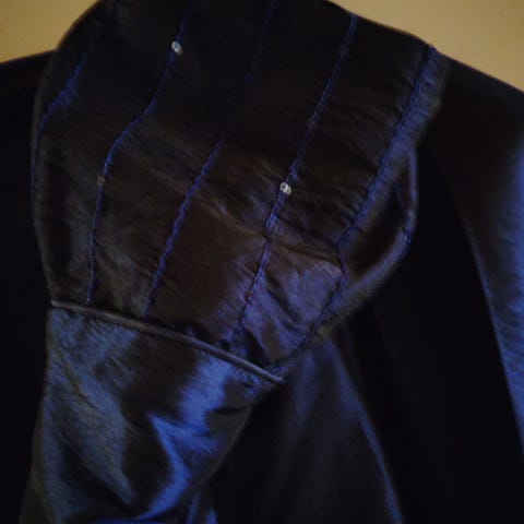 Tummansininen, yhdet tanssit tanssittu mekko Laona koko 36. Selässä pitkä vetoketju niskaan. Mekko ollut päällä 174cm pituisella tanssijalla, jolle mekko olisi voinut olla hieman pidempikin. Mekko sopii myös iltapuvuksi.