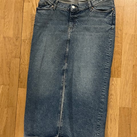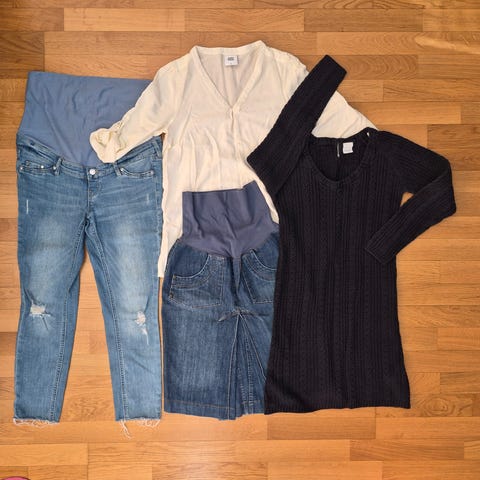Kaksiosainen äitiysvaate vuodelta 2004, silloin muutaman kerran päällä ja sen jälkeen säilytetty kaapissa sisätiloissa.