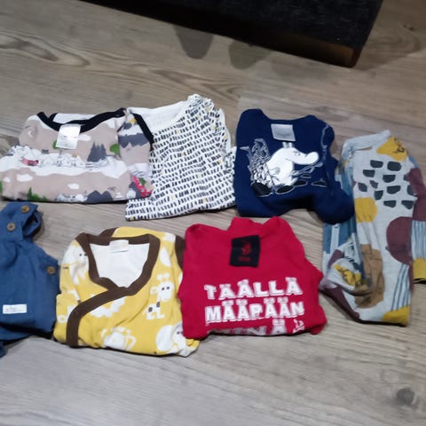 Hyväkuntoinen vaatesetti. Yhdessä yöpuvussa porkkanatahroja, ei ole yritetty poistaa tahranpoistoaineella.