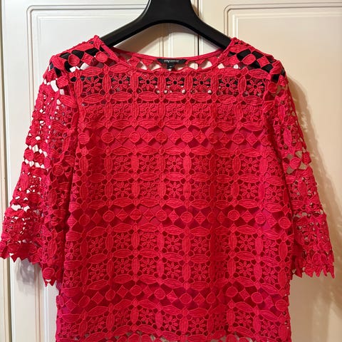 Pitsinen liivi vaikkapa mekon päälle. Ohut pitsinen neulos-liivi, koko XXL, pitkä malli. Edessä kaksi pientä kiinnityshakasta.