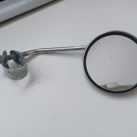 Myydään ehjä pyöreä peili heijastimella. Peilin halkaisija on noin 7 cm. Peiliä voi käyttää esim. polkupyörän taustapeilinä, kun sen asentaa jonkin kepin tai tukevan vaijerin päähän.