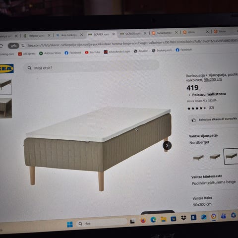 Sänky on ostettu 7/2022 Varrion kalusteesta. Mulla ei oo ollut koskaan näin hyvää sänkyä. Mutta tää on mulle yksin ihan liian iso. Vaikka sun unikaveri kääntää kylkeä yöllä niin et tiedä siitä mitään, tää sänky ei reakoi toisen liikkeisiin.