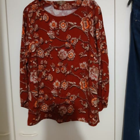 Kiva matkakäyttöönkin sopiva pusero, on rypistymätön, koska materiaali on kokonaan vekattu pienille vekeille. Vesipestävä laatu, helppohoitoinen. On pesty tuoksuttomilla pesuaineilla. Niskassa on pieni nappi, varanappi on tallella. Väljä, hiukan kellomainen, kauniisti istuva malli. On ostettu Sokos Wiklund brändi M & S. Kaunis herkkä kuvio jossa on lämmintä persikan sävyä ja luonnonvalkoista. Koko 48 tai XXXL