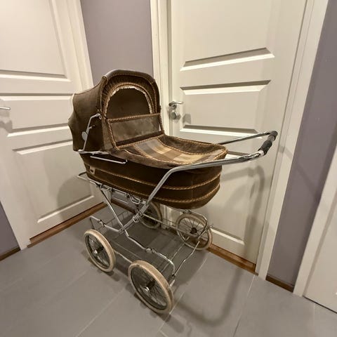 Heteka merkkiset lasten vaunut vuodelta 1953. Kuomu ehjä, lukuunottamatta pientä huomaamatonta viiltoa, noin 8 mm. Kaikki pölykapselit tallella, sekä käsilaukku koukku. Hyvä entisöintikohde.