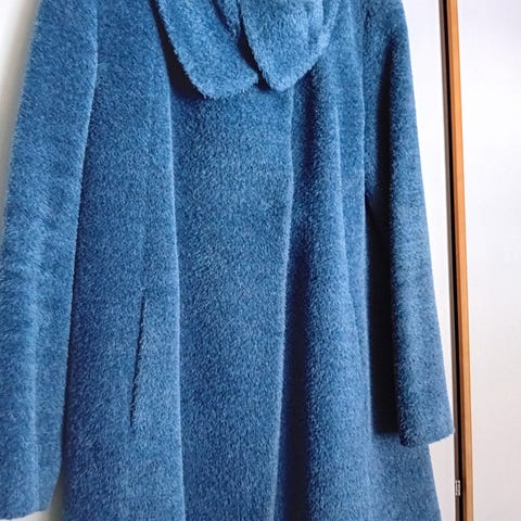 Naisten takki, ohutta laadukasta "villakangasta". Teetetty Kiinassa vaatturilla, takissa ei ole mitään koko lappuja tai kankaasta kuvausta. Takin voi halutessaan kääntää, mutta taskut ovat vaaleansinisellä puolella, toinen puoli on tumman harmaa. Koko on 38-40.