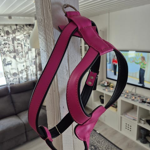 Vaaleanpunainen, pinkki, heijastimet, heijastin, heijastava, valjaat, t-valjaat, koira, nahka, nahkaa, suomi, suomalaiset