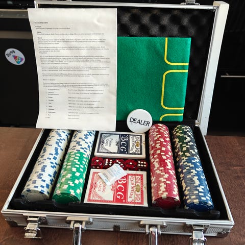 Miltei käyttämätön pokeripeli salkku. Toinen korttipakka, nopat ja kaksi pelimerkkitornia avaamattomia. Peliä vain osittain testattu kerran. Salkun saranatapit korvattu rautalankakiinnityksellä.