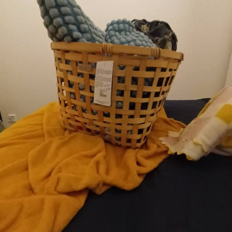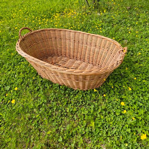 Kaunis, hyvässä kunnossa oleva soikion muotoinen rottinkikori. Ollut lankakorina. Korkeus kuvassa, leveys poikki suunnassa 45 cm.