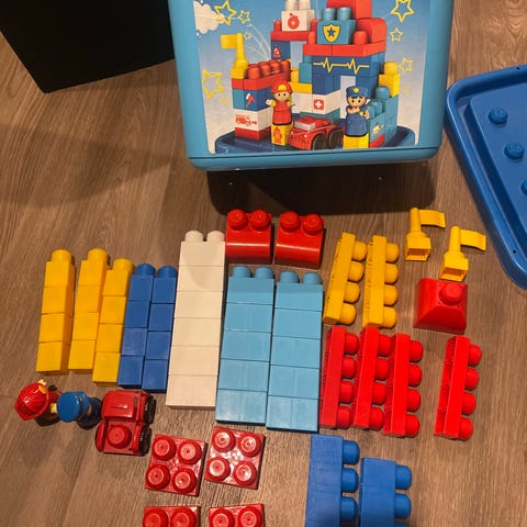 Mega bloks Tuomas veturi setti. Kaikki osat tallella. Lapsi liimannut tarrat.