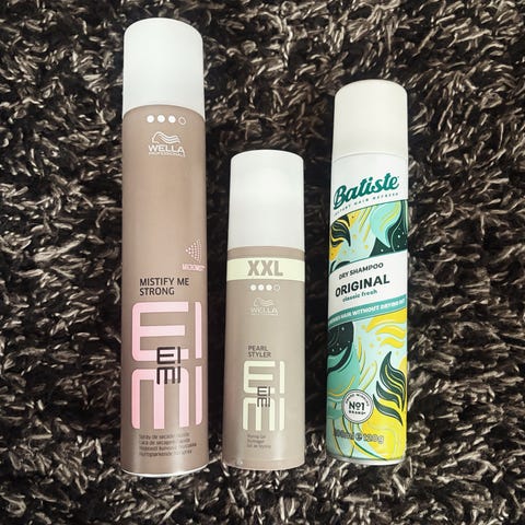 Batiste-kuivashampoo ja Wella-hiuslakka. Molemmat tuotteet on avattu, mutta erittäin vähän käytetty.