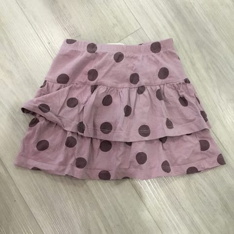 Vaaleanpunainen Creamie merkkinen hame violeteilla palloilla. Kokoa 128. Pesty hajusteettomalla pesuaineella. Savuton talous. Koiratalous.