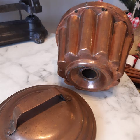 Kuparinen koristevuoka hedelmäkohokuviolla