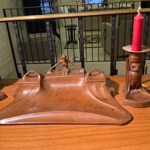 Vanha kuparinen koristevuoka, joka on hyvässä kunnossa. Kuviona hedelmät.
