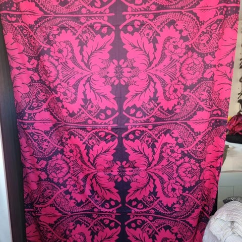 Marimekko verhot verhorenkailla. Ruusut printissä vähästi haalistuneet jossain kohdissa.