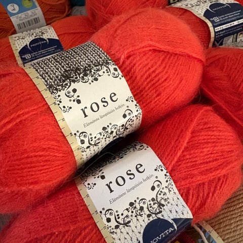 Herkullisen vaal.punaisen ja violetin, lilan sävyinen lanka jota 7 kerää samaa erää. Puikot 4ja1/2-5. Kerä 50 g=n 120 m. Vyötteen toisella puolella on ohje huiviin ja myssyyn, langankulutus 3 kerää siihen. 100% polyamidia. Hinta 12€+ pm. Toridiili ei ole käytössä. Ei tinkaamista